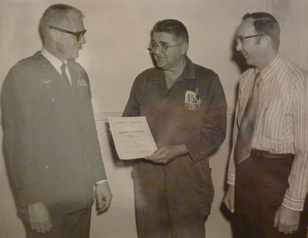 Of special interest my Grandfather worked at Lowry for a few decades working on various simulators, training aids and general handy man for the USAF. Going through old family photo albums here is a picture of him (centered) receiving an award from one of the AFB leaders